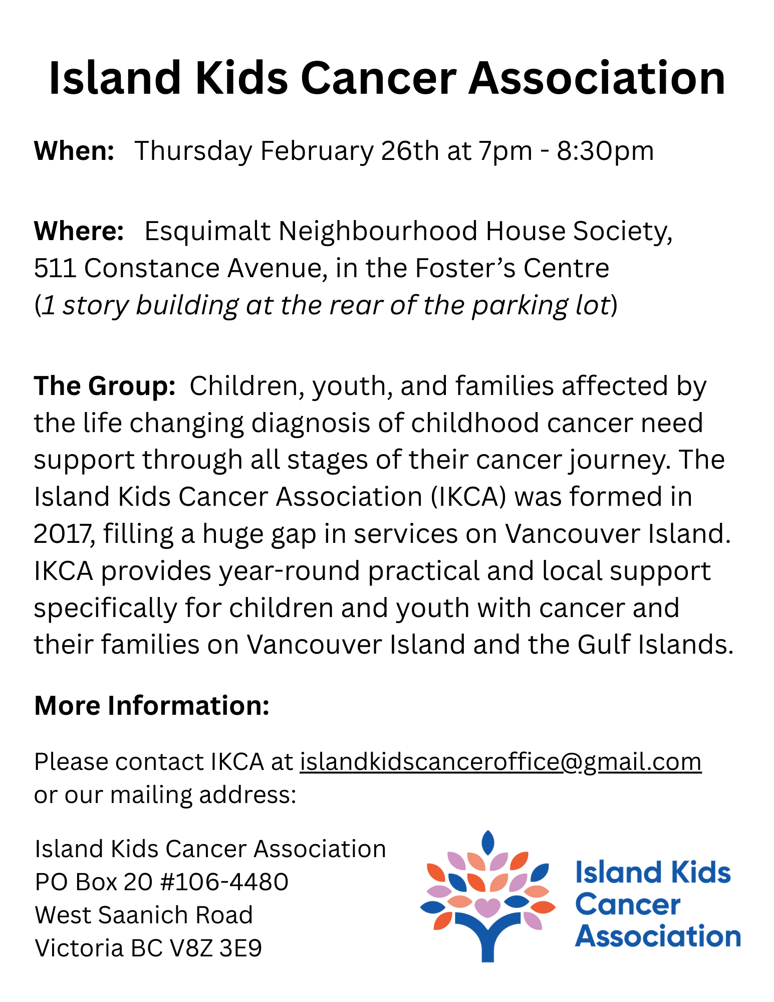 Where: Esquimalt Neighbourhood House Society, 511 Constance Avenue, in the Foster’s Centre (1 story building at the rear of the parking lot)