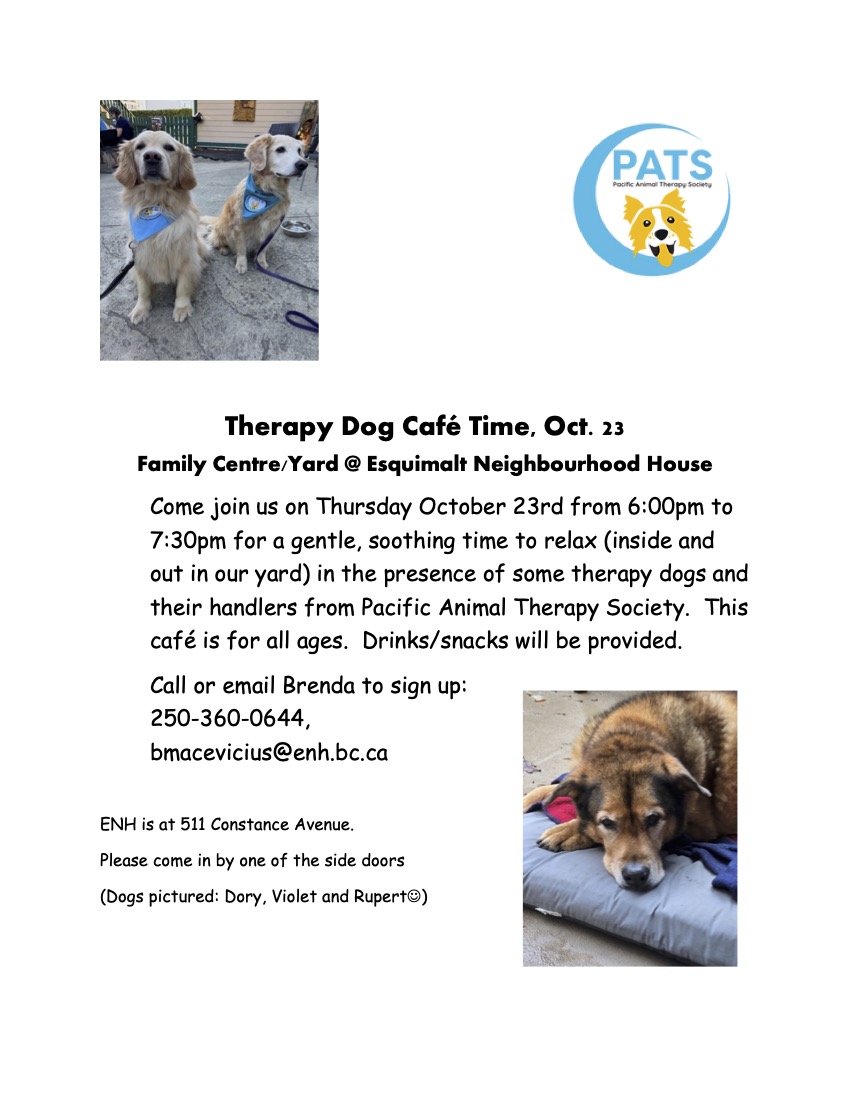 Come join us on Thursday October 23rd from 6:00pm to 7:30pm for a gentle, soothing time to relax (inside and out in our yard) in the presence of some therapy dogs and their handlers from Pacific Animal Therapy Society. This café is for all ages. Drinks/snacks will be provided.